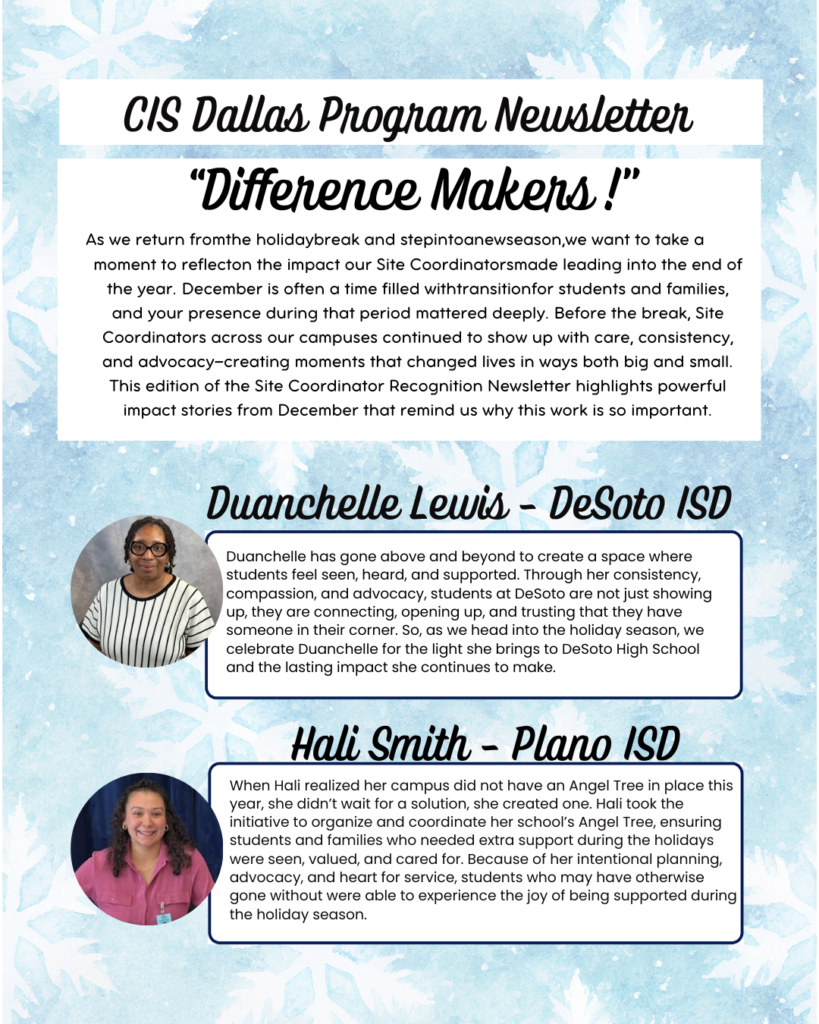 December is often a time of transition for students and families. Routines shift, needs can intensify, and uncertainty is common. During this critical period, our Site Coordinators continued to show up with care, consistency, and advocacy—providing stability and connection when it mattered most. Their presence created moments of support and encouragement that made a real difference, both in visible ways and in quieter, deeply personal ones.